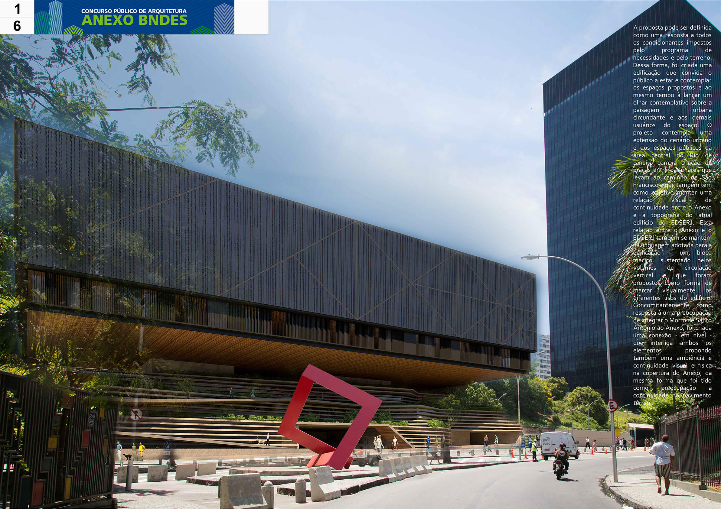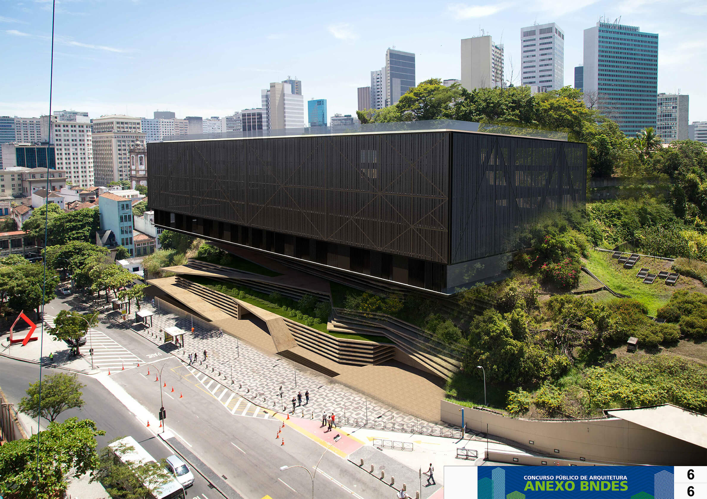 A paisagem aparece como protagonista, seja como refúgio, passeio ou contemplação. Desse modo, o projeto do Anexo contempla uma extensão do cenário urbano e dos espaços públicos da área central do Rio de Janeiro com a criação de praças entre patamares que levam ao caminho de São Francisco, que ladeia todo o prédio do BNDES, mantendo uma relação visual de continuidade entre o Anexo e a topografia do atual prédio.